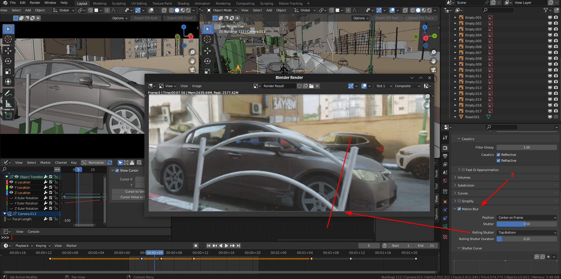 What did not work, is again probably would require some proper complaining to the Blender devs. For some reason I cannot turn on motion blur and rolling shutter in the same time. I get either one or the other and there is no way to apply any motion blur even in post to a rolling shutter shot ( it stops me from doing a vector pass ). There is absolutely no reason to simulate rolling shutter inside of Blender ( at least when it comes to visual effects ) if you don't have any motion blur in the same time. The whole idea of the rolling shutter is that it is a distortion of an image from fast motion. It has to have motion blur.