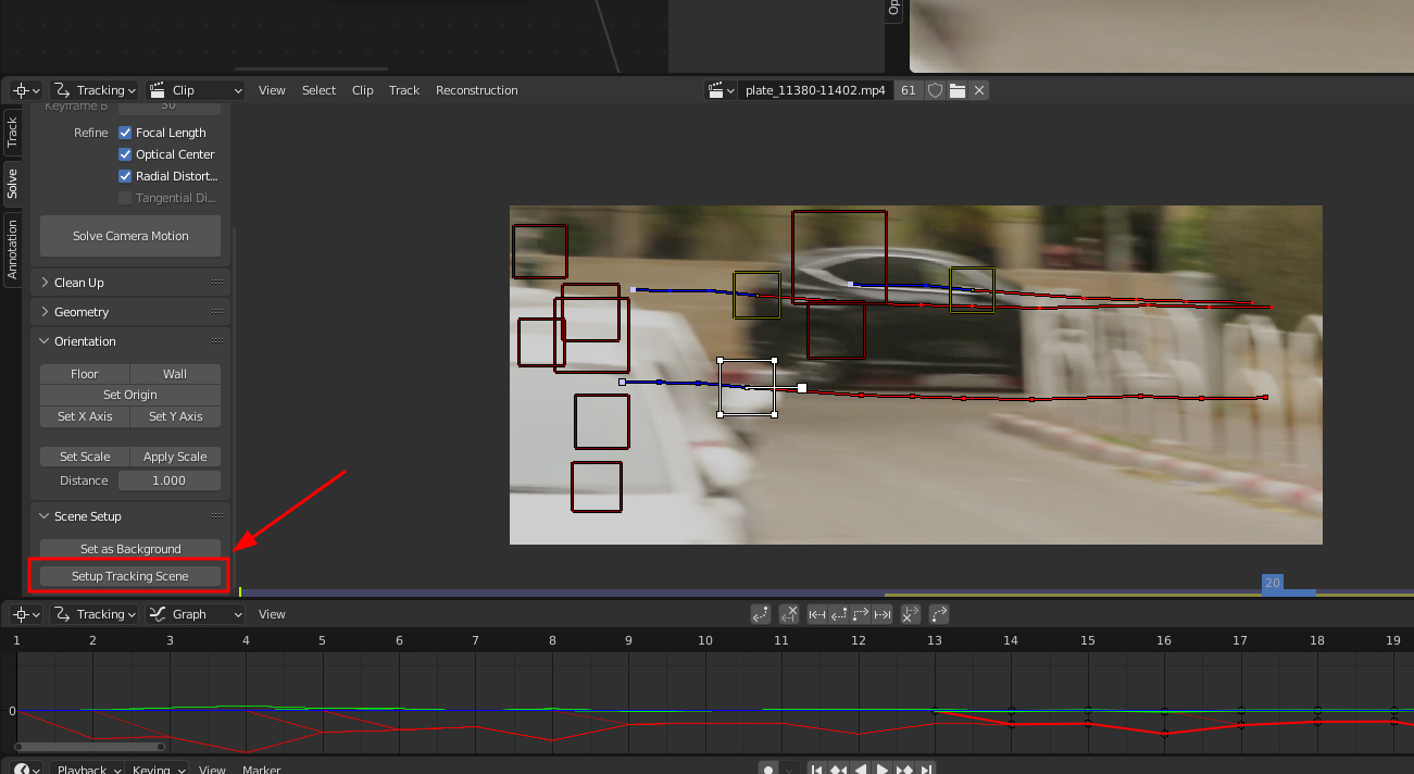 VFX shot 1 was surprisingly simple. It is documented fully on my peertube channel. Since the camera was zoomed in and far away from the action, I could track it using the "tripod solver". Usually with camera tracking in Blender, you need at least 8 good points, to get a pretty good 3D track. But since the camera is so far away, there is barely any parallax. So I could use 2 points instead. 2, so I could track changes in rotation.