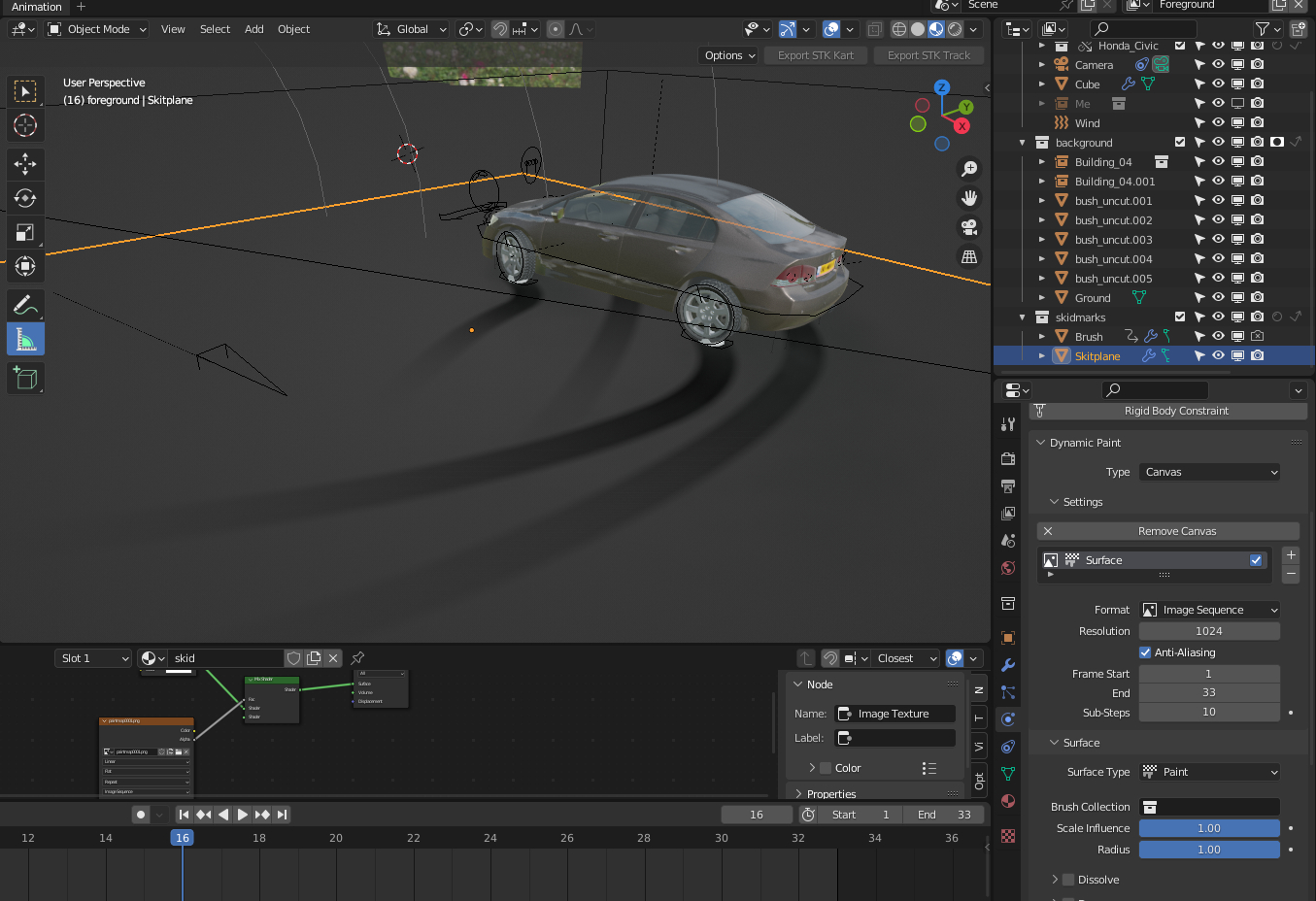 The skid-mark was done using Blender's amazing dynamic paint simulation tools. I basically added a little object under the wheels that touches the ground. And made that object a "brush" while making the ground a "canvas". And it "rendered" for me a set of images of what it would look like if those "brushes" painted on the "canvas". Those images I could then put onto the plane as a texture. And render it as a pass, to composite between the shadow and the car.