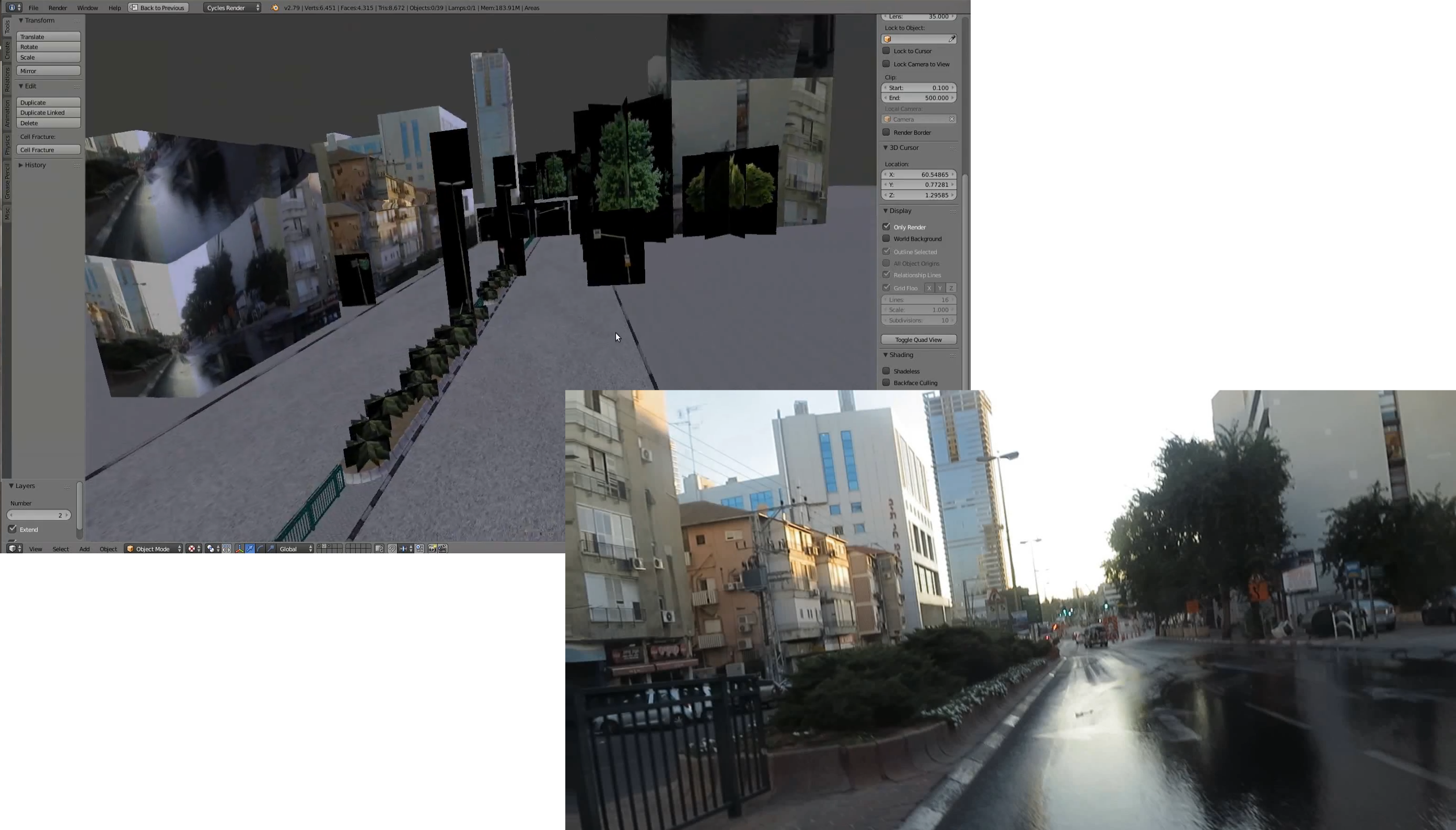 I cut out the cars from the reference shot. And I placed planes with the texture of those cars into the 3D scene. And it pretty much worked out of the box. I had to slightly deform those planes to give it a suggestion of parallax. And I had to yank the virtual camera quite violently, to hide the mess. But it worked.